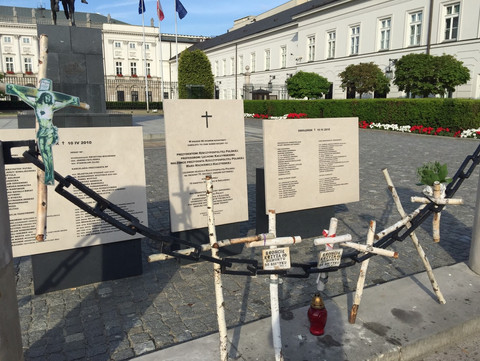 ▲位於皇家大道上的總統官邸,波蘭現任總統卻沒有住在這裡。2010年4月,波蘭總統專機墜毀於俄羅斯境內,機上除了波蘭總統夫婦,還有政府高官、國會議員及軍事將領,一行97人無一生還,波蘭瞬間頓失一半內閣成員。這場突如其來的噩耗讓波蘭舉國上下哀戚不已,時至今日(右),弔念的十字架與花束仍絡繹不絕。